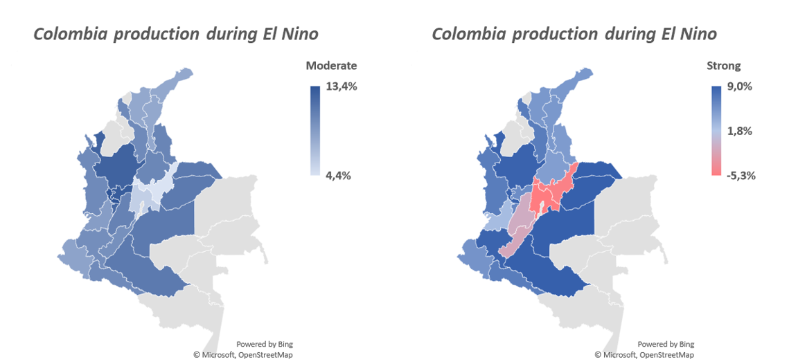 Not all El Nino events are the same and some are more beneficial than others. In the Colombia case, the moderate events have increased coffee production when these events have interacted with other positive external factors. On the other hand, strong or very strong events can be less beneficial and even negative to the production growth due to worse conditions to fix the flowerings and the vegetative health of the coffee plants.