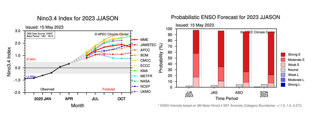 The probabilistic ENSO forecast points to a weak El Nino during June, July and August then the probability increases faster towards Moderate and even Strong event to the second half of the year.