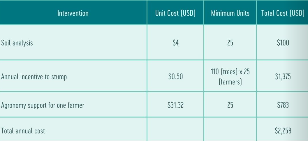 Based on the pilot project (30% of farmers from 7 different AMCOS), an intervention tailored to individual farms could lead to a minimum yield increase of about 280 MT of coffee cherry (based on an average farm size of 200 trees) across all 1,400 participating farms with an average yield increase of 1 kg per farmer per year.