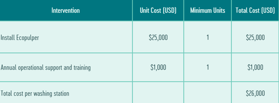 - Save water. Approximately 8-10L of water per kg of wet parchment is used during the pulping and washing process at the AMCOS. The eco-pulper will considerably reduce this amount to 1.5L per kg of wet parchment.