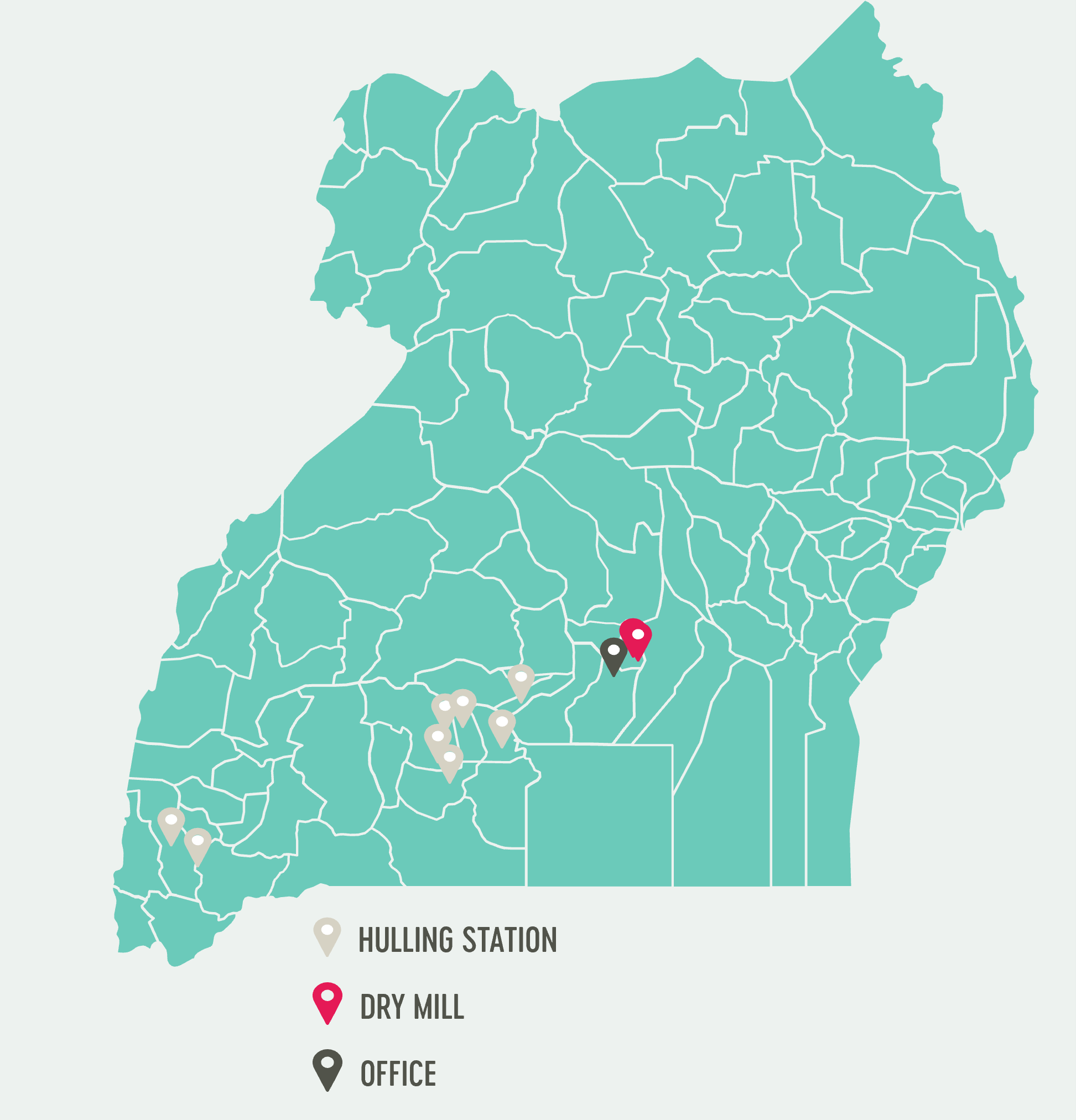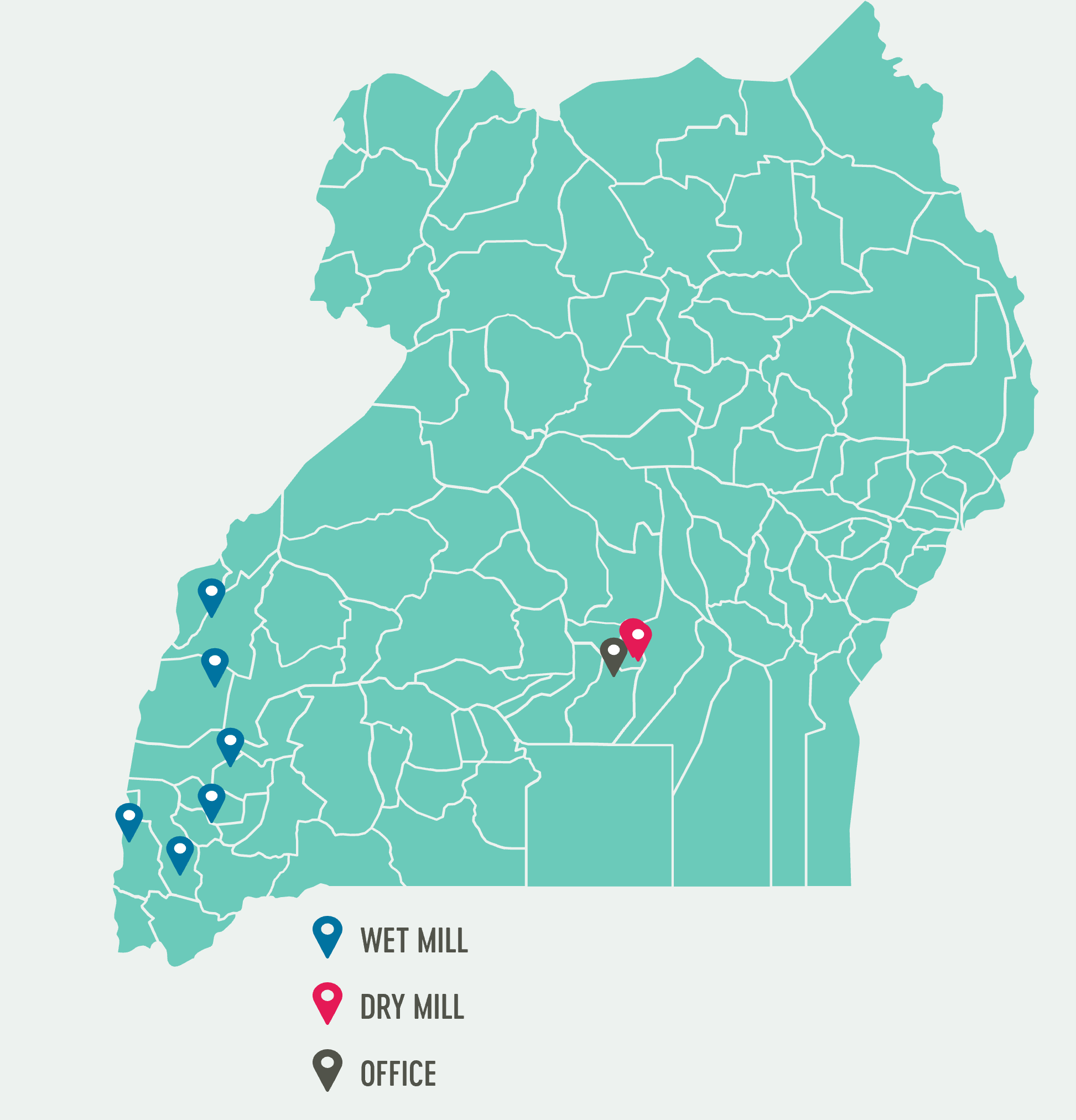 We built our first washing station in Western Uganda in 2019. Today our infrastructure includes 6 Arabica Wet Mills; 2 Dry mills; Warehousing Facilities; 8 Hulling and Collection Centers; and Offices, of course, in Kampala.