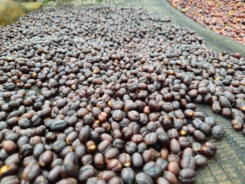 Farmers selectively handpick cherry and deliver it to the washing station. At intake, employees hand sort incoming cherry to remove any under- or over-ripes or damaged cherry. Cherry is placed in a container and sealed so that no air can enter. In this sealed environment, fermentation begins. Because the skins of the cherries are left intact, fermentation may take days or weeks. Once fermentation is complete, cherry is removed, washed in clean water and laid on raised beds to dry. Drying coffee is raked regularly to ensure even drying.