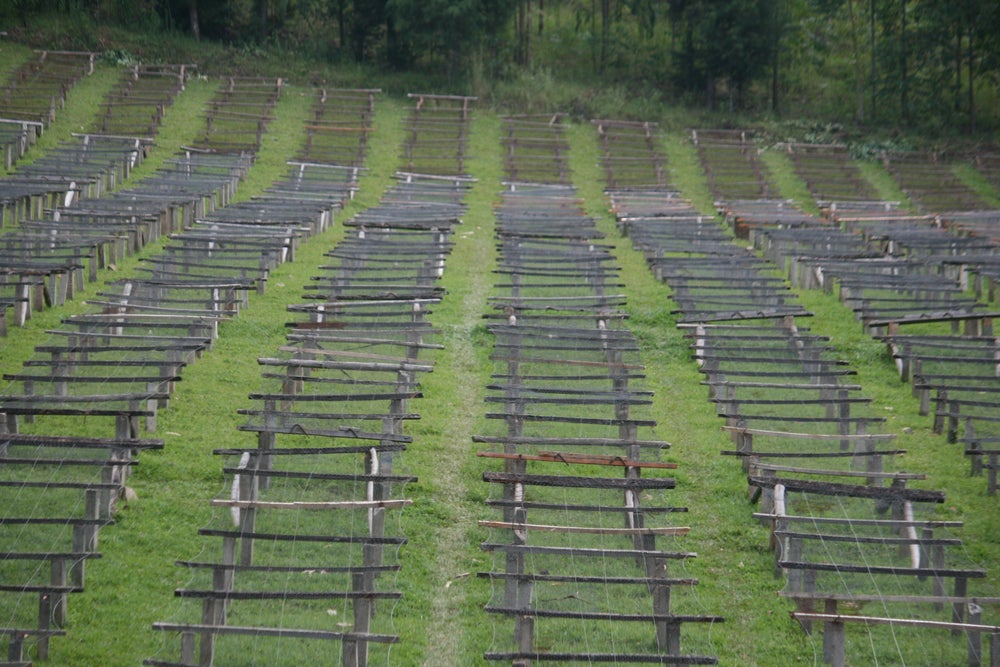 Cherry is laid in thin layers on raised tables where it is turned frequently to enable even drying. Cherry is covered when its rains, during the hottest part of the day and overnight.