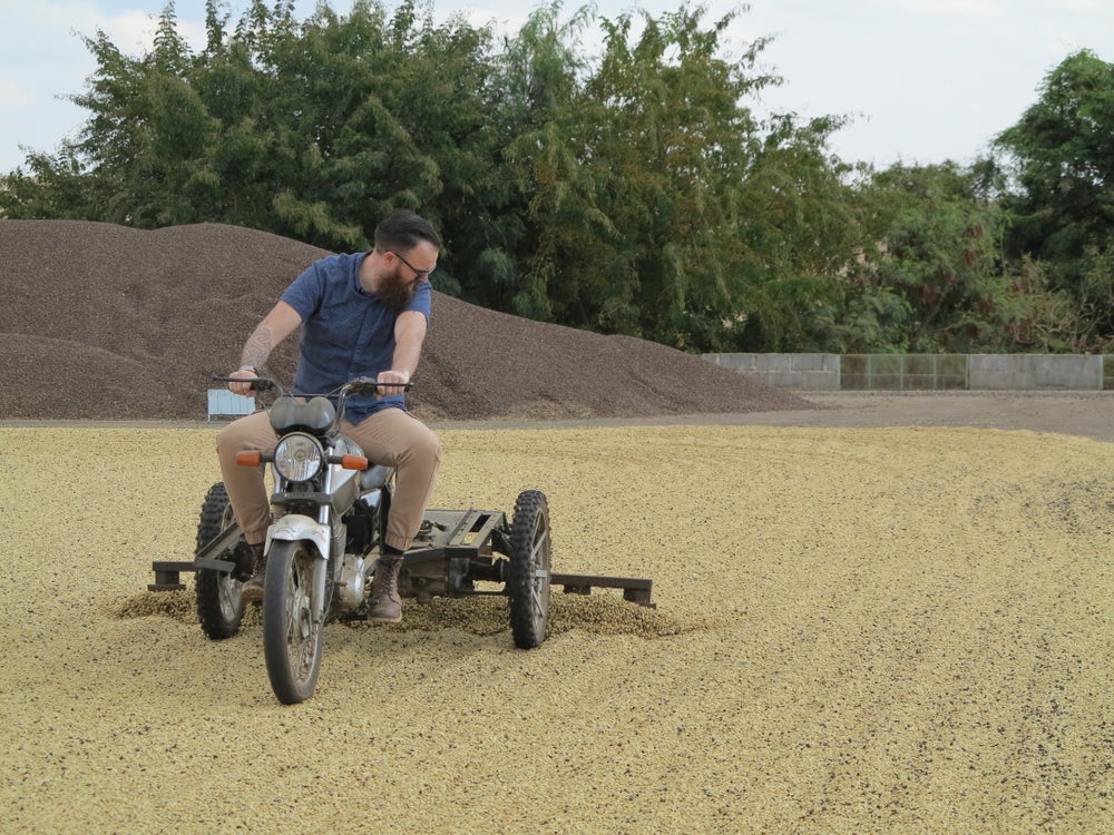 After harvest, cherry is pulped and laid to dry on patios. While sun drying, cherry is carefully monitored and turned frequently.