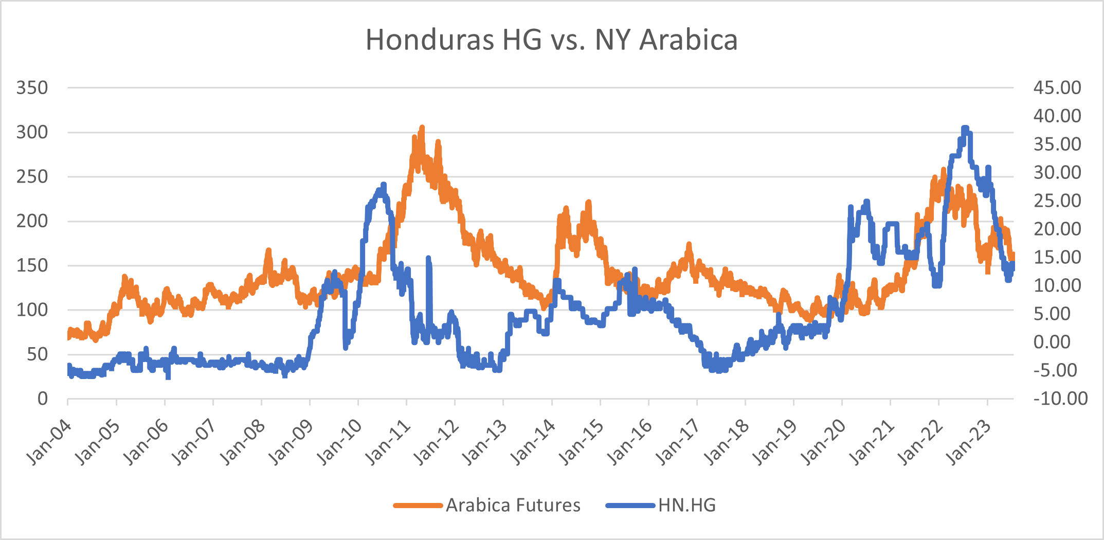 Moving to Honduras, we can see a far more dynamic picture with the NY Arabica market. It seems that Honduras HG differentials have 4 stories to show from the above time series. The first period, 2004-2009 shows the typical negative relationship between futures prices and diffs. A rally in futures brings diffs down to -4/-5 while a market collapse below $1 results in Honduras diffs going above tenderable parity (the value at which you can break even or make money by grading and certifying the coffee with ICE exchange) The second period is 2009-2013 where we saw a major deficit in Arabica globally. There, Honduras differentials form a strong leading indicator for both the futures rally and the subsequent futures collapse once the arabica deficit resolves with demand shifting strongly towards Robusta. The third period of 2013-2019 sees return to the common relationship of higher prices lower diffs and vice-versa on a more volatile scenario than 2004-2009. The drought in Brazil in 2014 brings Honduras diffs to below +5, and then the subsequent rally in 2016 - combined with an excellent Honduras crop - results in an oversupply of Honduras coffee and sees differentials break to tenderable levels for the exchange. Lower futures prices then see lower investment, and Honduras differentials climb steadily in 2019 and 2020. In the 4th story of 2020 to present, differentials for Honduras are much more dynamic and volatile, oscillating between +10 to as high as +37. Here the story is complicated by the logistics issues borne out of Covid as well as the long-term inversion in NY futures, but overall, I would say differentials for Honduras have behaved like they did in 2009-2013 when a spike indicated an imminent futures rally, and a collapse in Hondo HG diffs in late 2022 preceded the collapse of NY arabica futures.
