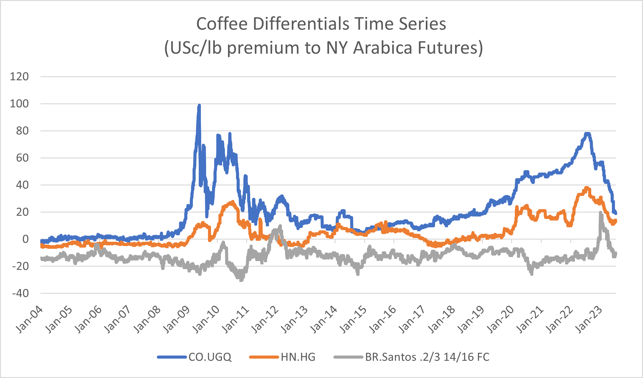 The table above shows the time series of differentials for the 3 benchmark qualities since 2004. As you can see, Colombian UGQ are by far the most volatile differential, seeing spikes up to +100 premium in 2009 and going up to +80 in 2022. Brazilian Fine Cup differentials also show a high amount of volatility, oscillating by as much as 40 cents in a single year (2011 and 2023 are examples).