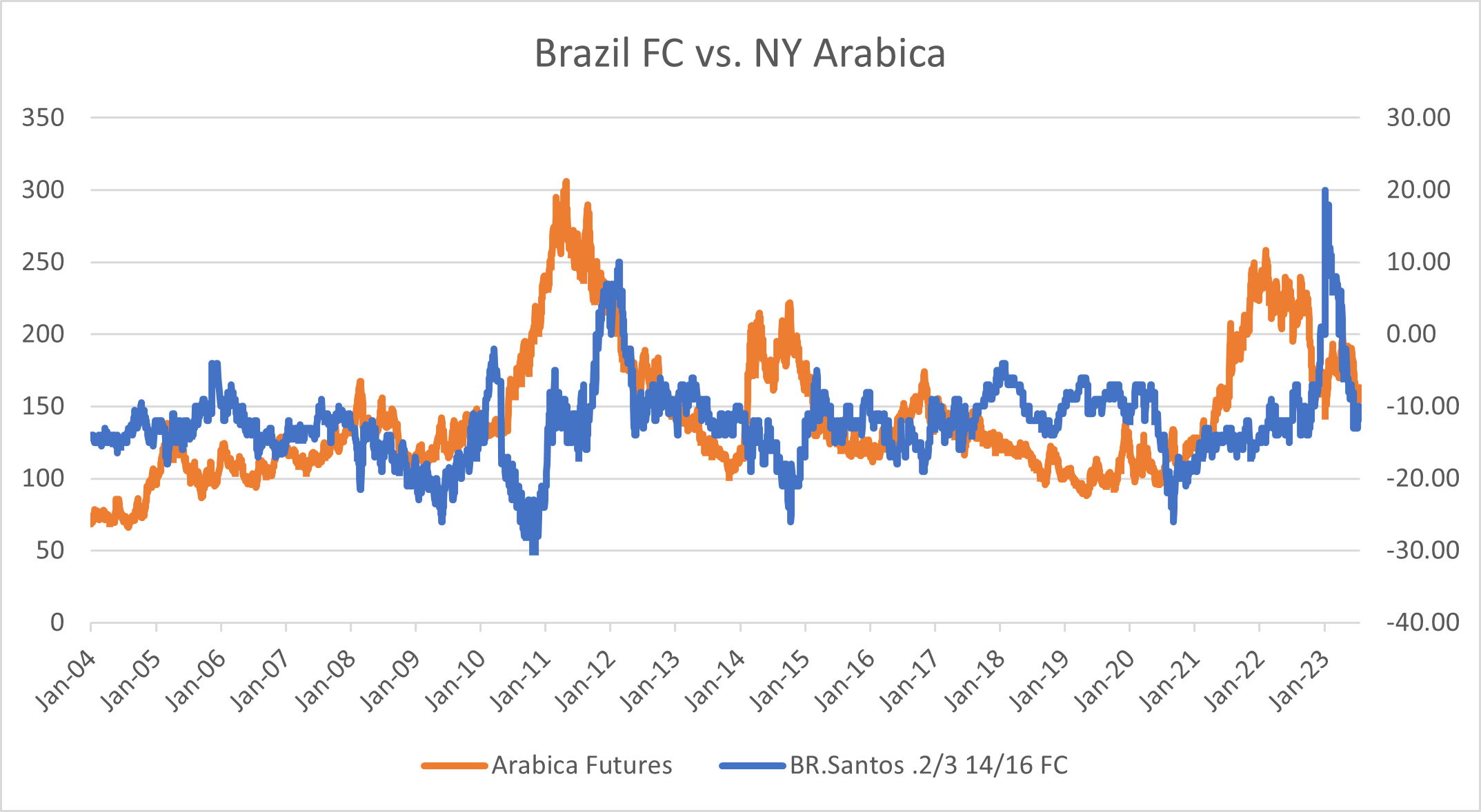 Lastly, looking at Brazilian FC diffs, we can finally see perhaps the clearest relationship in higher futures market leading to lower differentials and low futures market resulting in a rally in differentials. It makes sense that Brazil FC is the grade that follows this relationship most closely since Brazil is the dominant Arabica origin and large changes in Brazilian internal market dynamics have an overall impact on the whole coffee market and futures. The only two major exceptions to the common negative correlation (180 day rolling correlation is most negative at -0.24) were in 2011-2013 period during the historic rally in Arabica futures, and Q1 2023. I In the first scenario in 2012, Brazil had to win over roaster demand, which it did by being by far the cheapest Arabica around for a year while futures went to record highs. In a way, during that period, Brazil had to “decouple” from its historic relationship by attracting demand. However, in the following season it could not produce enough coffee during its off cycle to satisfy that demand, and futures had to readjust despite the overall futures market climbing higher. The last, much more recent scenario involved a historical rise of Fine Cup differentials to +20 after the futures market saw its most rapid collapse in history, falling from 218 in October 2022 to 144 by Jan 2023. It’s important to note that FC diffs didn’t materially change in the initial fall in the market from 218 to 175 during October 2022. Most of the appreciation happened below 150, when the Brazilian farmer chose to essentially stop selling coffee. Coinciding with the start of the new year, the Brazilian farmer was able to hold back supply enough to get roasters to pay up differentially by essentially creating a strong floor at 150 USC/lb flat price. In that regard, the market power of the Brazilian farmer is notable and, out of the three differential studied, Brazilian FC has the strongest correlation to the futures market.