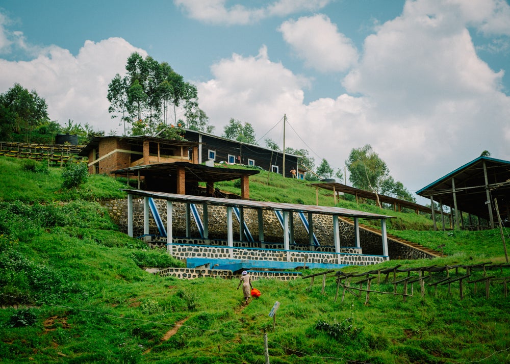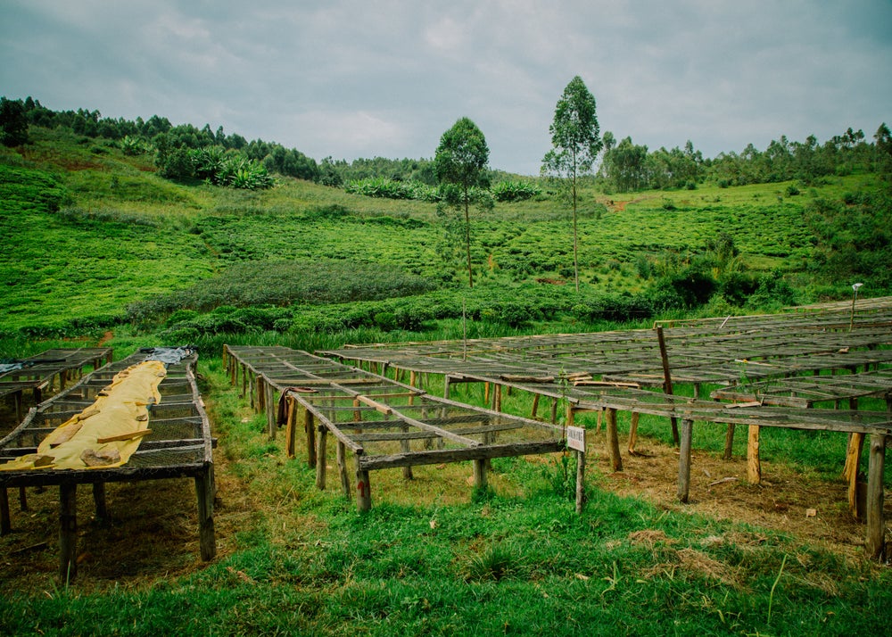 The washing station lies much lower than the farms that produce its coffee. This makes it easier for the producers to carry their coffee cherries downhill after the day's harvest. Placing the station down the hill also facilitates the water supply to the station from the nearby river network. The orientation of the farms in the hills means that the coffee trees catch a lot more sun hours than the washing station itself. The drying field of the station has less direct exposure to sunlight, which slows down the coffee drying process. In some circumstances, slow drying can cause difficulties, presenting opportunities for fungal or bacterial infection. However, at Nyakarenzo very careful care is taken to ensure even drying and good aeration through the process.