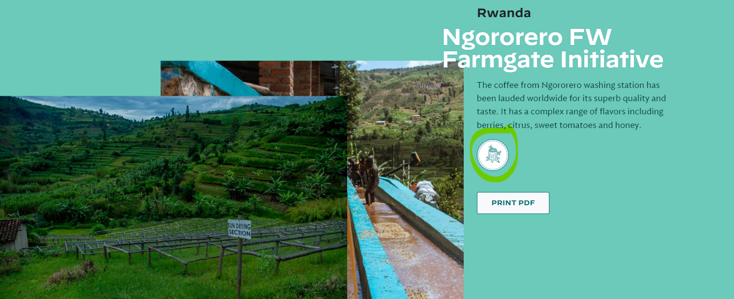 Interested in buying coffees that contribute to the Farmgate Initiative? Look for a sustainability icon under the opening paragraph on the coffee profile page: